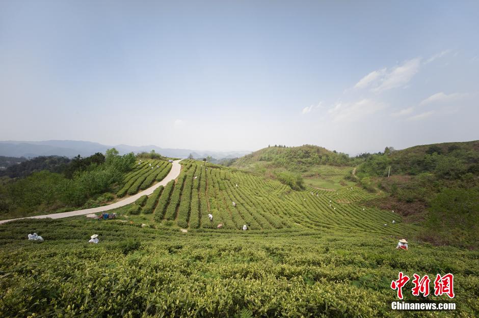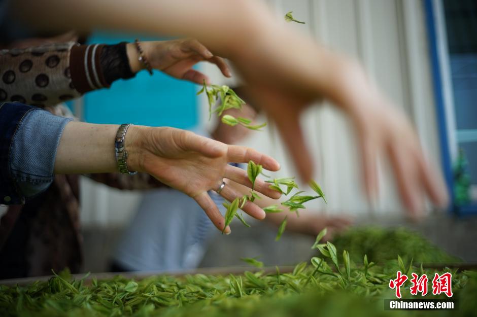 4月2日,位于贵阳市城郊的百花湖柏春神鹊茶场,当地茶农忙于采摘、制作明前茶。贺俊怡 摄